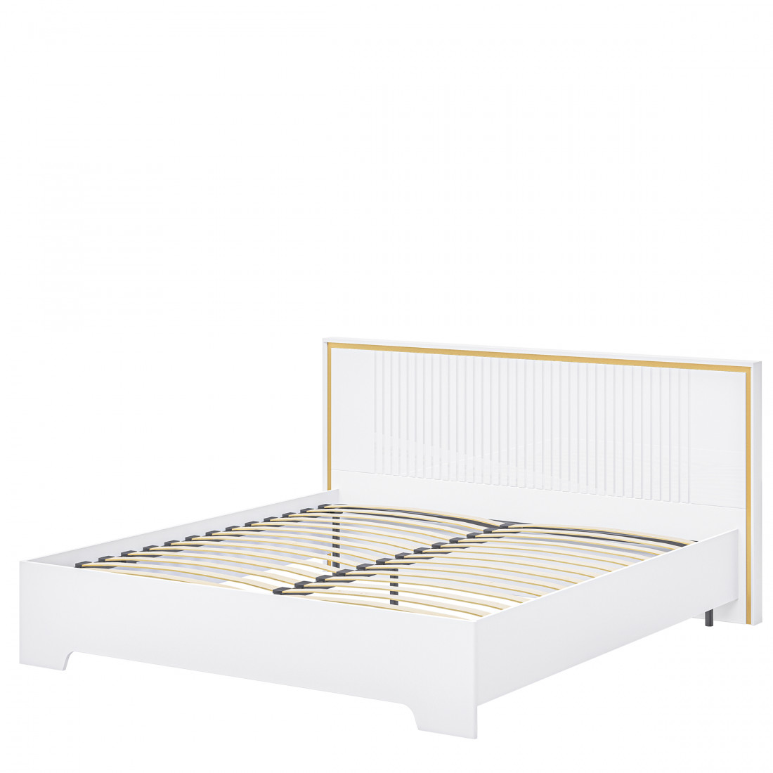 Белоснежная кровать из МДФ в цвете белый глянец. Изголовье кровати украшено золотистой каймой и рефленной фрезеровкой.