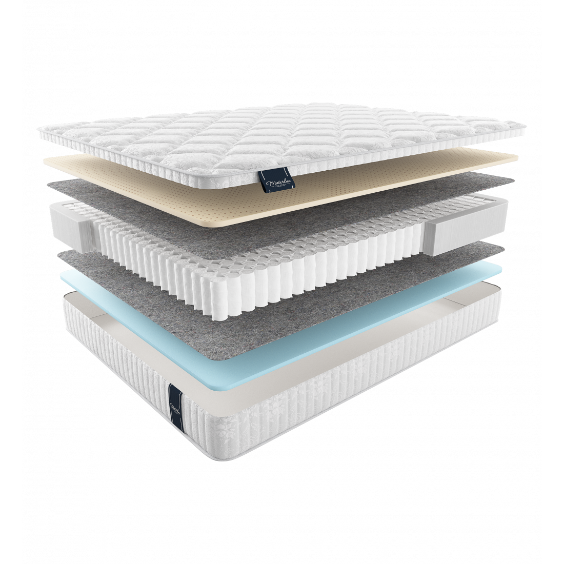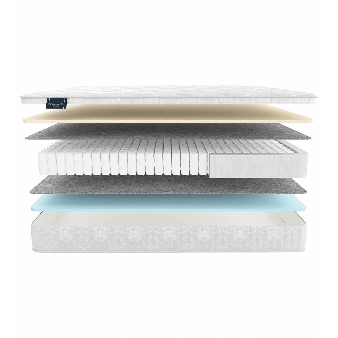 Двусторонний пружинный матрас со сторонами различной степени жесткости. С одной стороны расположен натуральный латекс, «дышащий» и экологически чистый материал, обеспечивающий идеальную поддержку контуров тела, а с другой – его аналог, Natural Foam, имеющий чуть более плотную структуру.