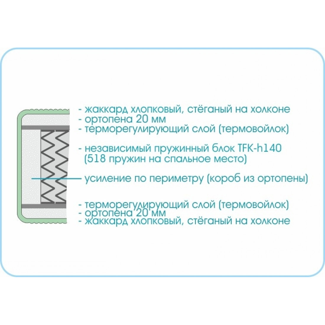Наполнение: независимый блок TFK, высота блока 140 мм, ортопена 20 мм с двух сторон, терморегулирующий слой с 2-х сторон, усиление по периметру - короб из ортопены.