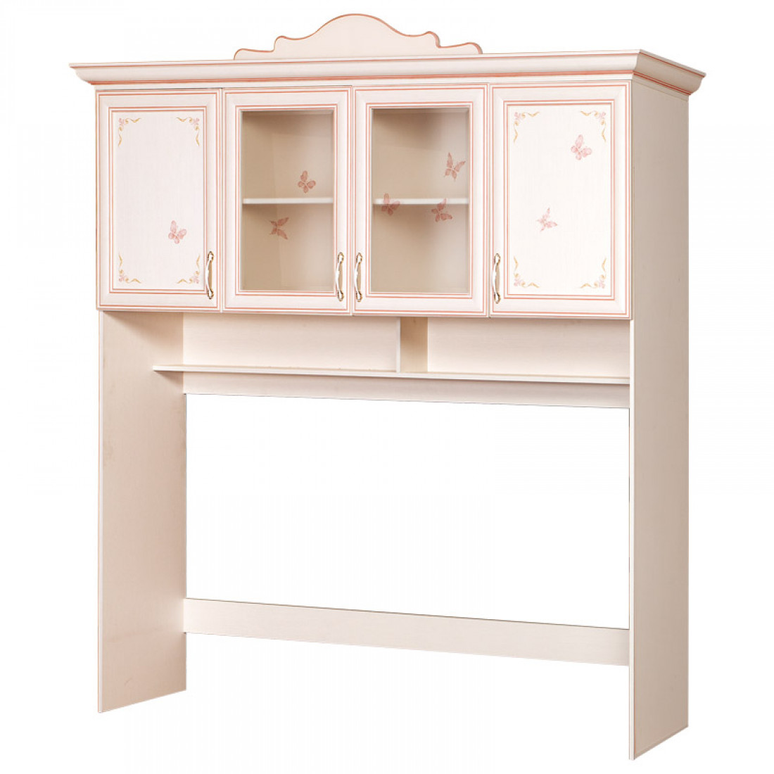 Фасады: МДФ, декор – кремовый белый, рисунок, патина, стекло с фацетом и рисунком