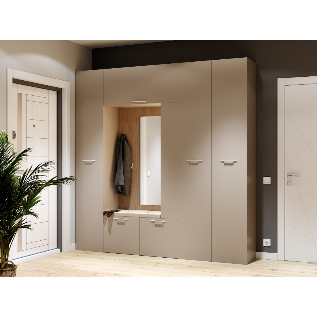 Прихожая “Джерси” в цвете капучино - это идеальное решение для тех, кто хочет создать уютное и стильное пространство в своем доме. Она сочетает в себе удобство и функциональность, позволяя хранить одежду, обувь и аксессуары в порядке.