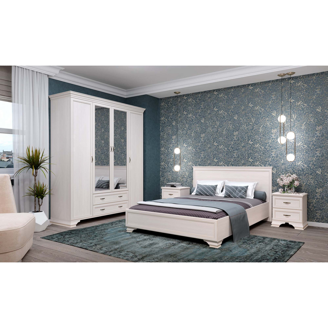В состав модульной программы входят три вида шкафов. Четырехдверный шкаф стандартно комплектуется глухими боковыми фасадами, центральные двери к нему предлагаются на выбор: с зеркалом или без. Двух- и трехстворчатые шкафы комплектуются фасадами в зависимости от предпочтений покупателя. Коллекцию дополняют два вида комодов (традиционный и высокий) и кровать с подъемным ортопедическим основанием трех типоразмеров, оснащенная вместительным бельевым ящиком, а также диван-кровать с двумя бельевыми ящиками. Для создания уютной и функциональной молодежной комнаты могут быть использованы элементы гостиной и спальни «Сиена».